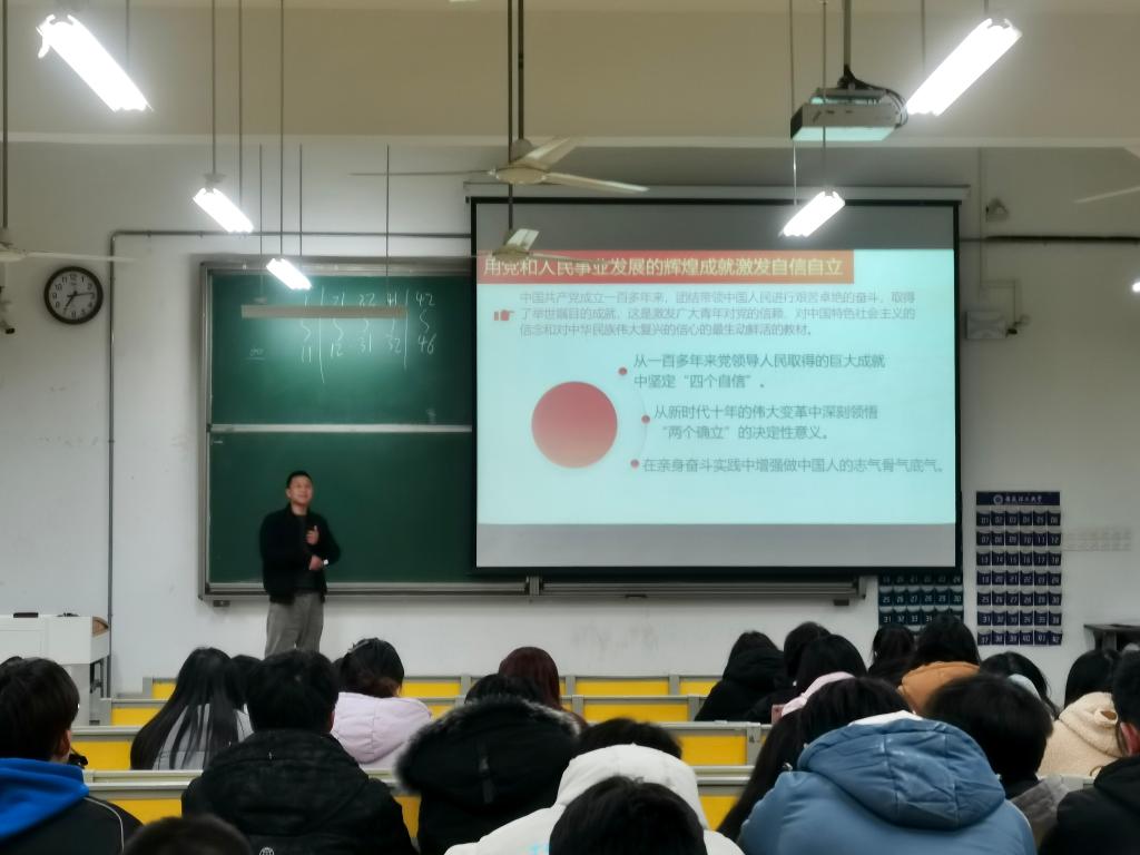 各班级通过辅导员领学、学生宣讲团宣讲、班级团支部自学等方式,掀起党的二十大精神学习热潮。在课程中,2020级辅导员汪义庆带领同学们回顾了中国共产党团结带领中国人民取得的重要举世瞩目的成就,用党和人民事业发展的辉煌成就激发广大青年学生自信自立,同时结合大三年级学生考研、就业、创业、参军入伍等未来发展的路径,激励同学们在全面建设社会主义现代化国家的宏伟蓝图中建功新时代。